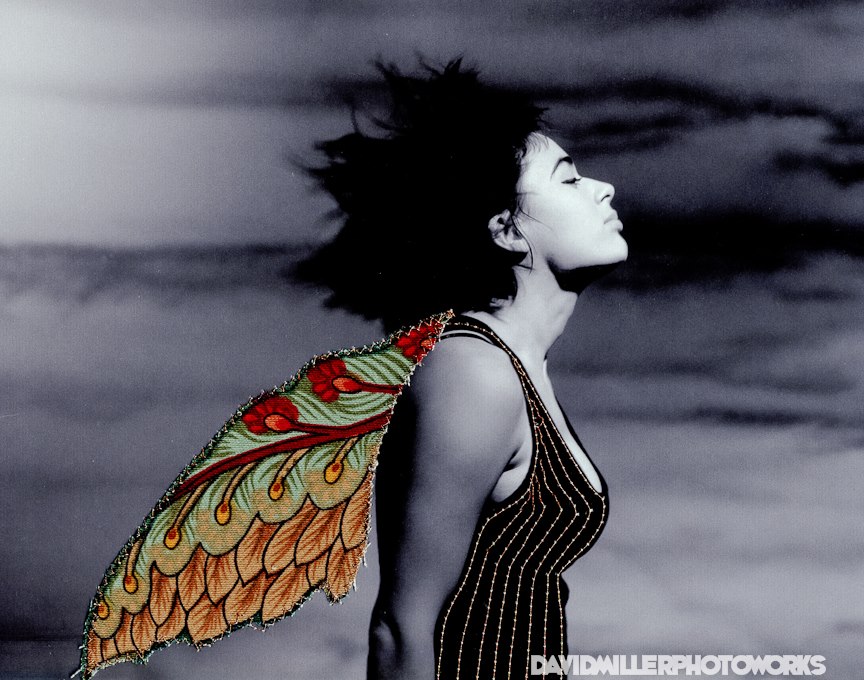 It helps to have an artist spouse. My husband is a photographer and I sometime borrow photos he took and stitch on them. This time I added wings to the model.