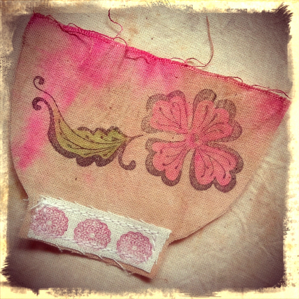 (walnut ink, Dylusions ink spray in bubblegum, stamps, and fabric markers)