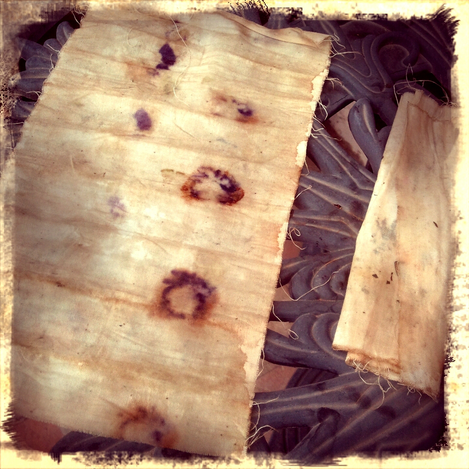 This time for the pages inside I am trying to dye my own fabric. Dying fabric can get somewhat messy, but I am cheating. I am wetting the fabric and then applying some ink by either soaking or spraying the fabric. I am adding plants and berries for a more natural tie-dye look. Then letting the desert sun do the rest.