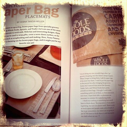 Green Craft magazine was kind to include my work in their coming issue. I made placemats using brown paper bags from stores like Sprouts, Whole Foods and Trader Joe’s. The magazine is out August 1st, and many local craft stores carry it. You could order a copy too, from the publisher directly at http://www.stampington.com