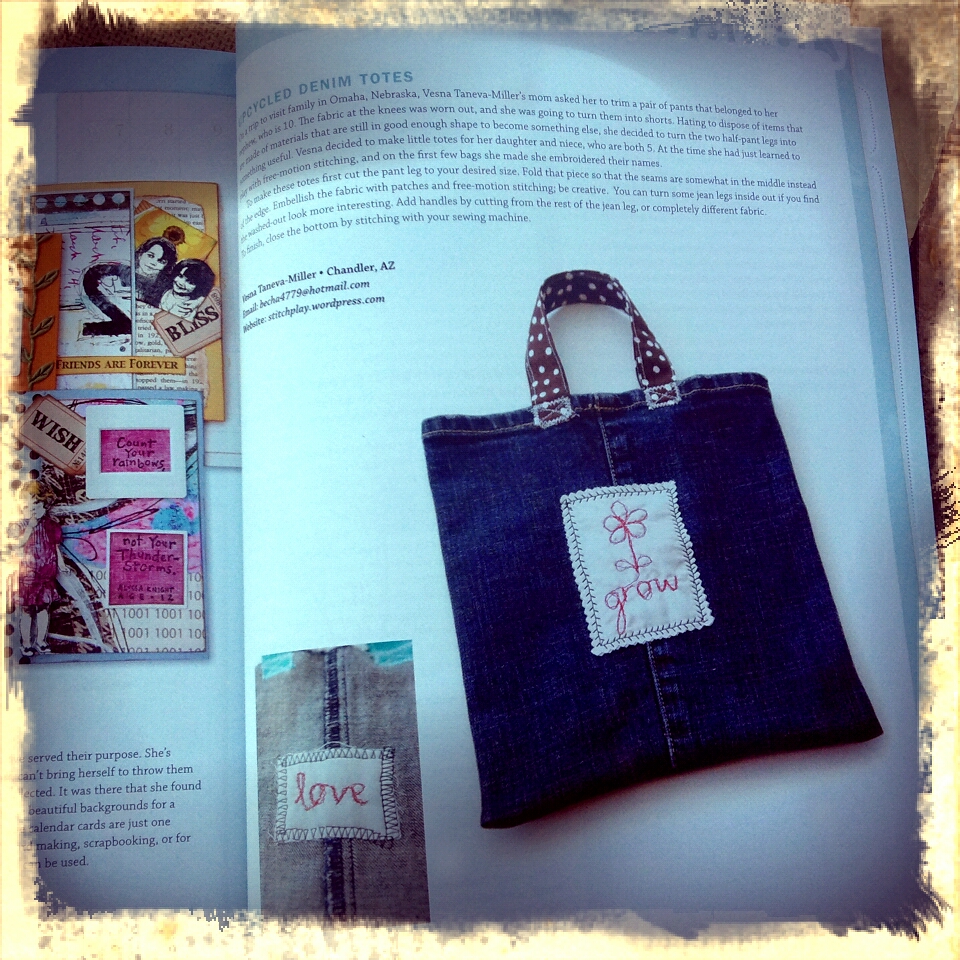 Last year I made a bunch of these and played with decorating them using free motion stitching. I sent them off to GreenCraft magazine and was delighted to see they selected them and are going to be published in the coming issue (out on newstands in November).