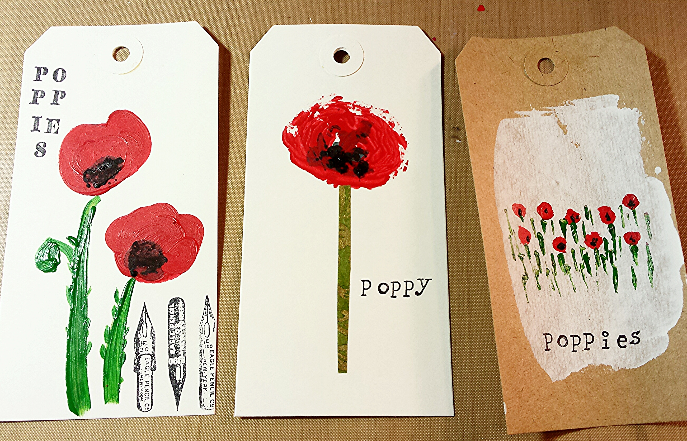 This was my first visit after being away for 18 years. The things that left the most impression, are the very same things that always came to mind when I thought of the times I used the live there: poppies. And this weekend I finally got some time to give my hands a try to paint. I kept it small, it was easier, and made tags. Red poppy tags.