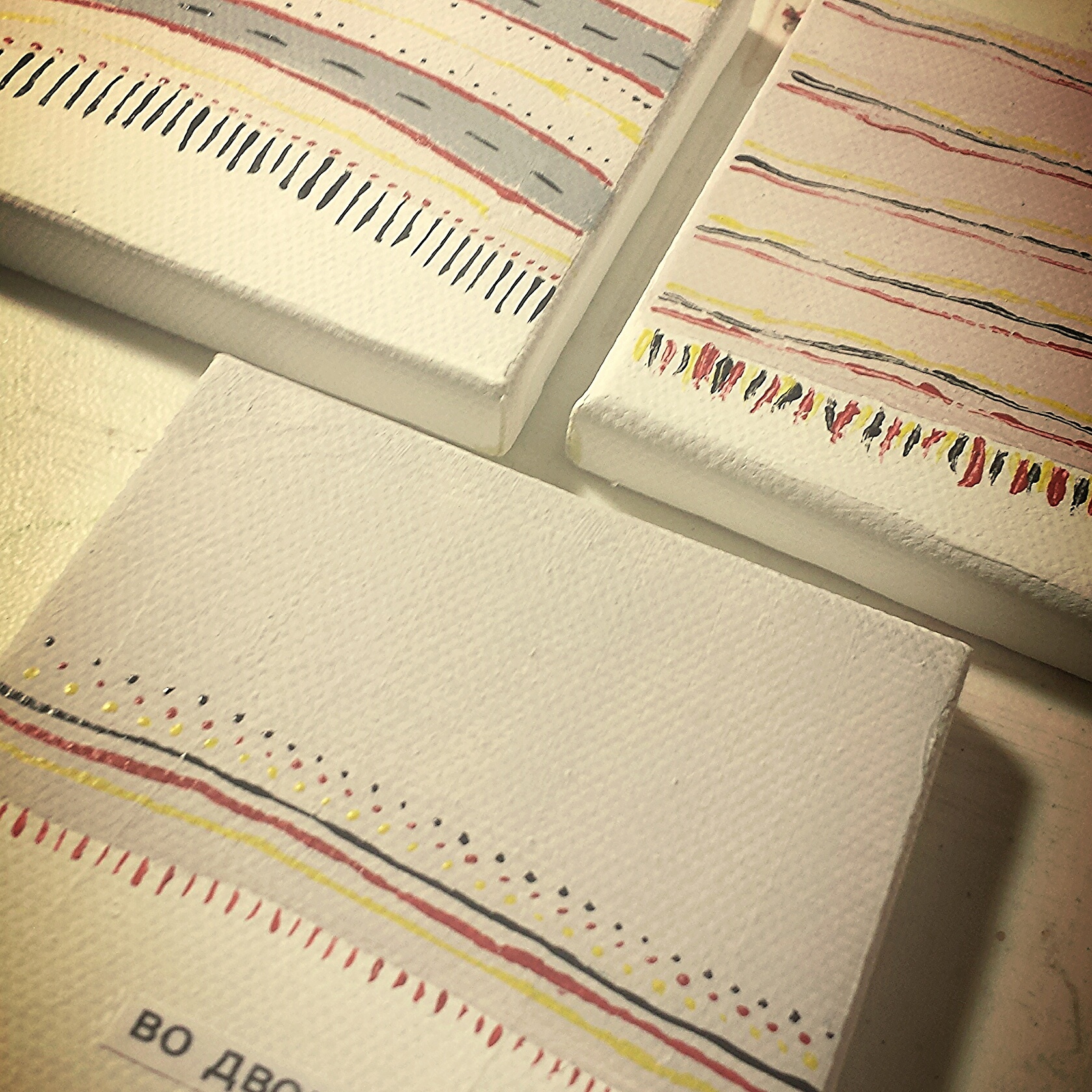 These are my first 3″ x 3″ canvases. I tried to picture the woven rugs in Macedonia. I forgot to bring one home, and painting them was the next best thing.