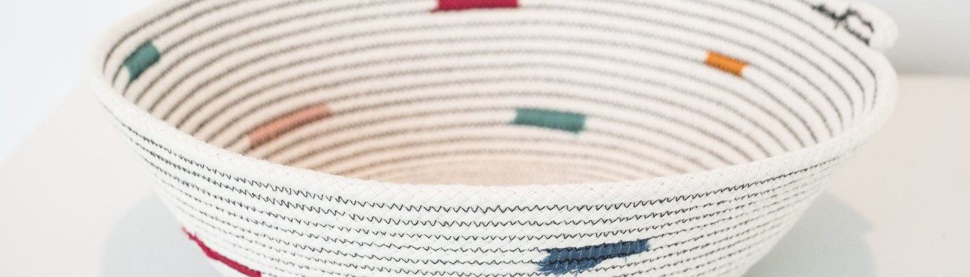 Once you learn the basic technique of stitching the rope to form a bowl, the possibilities to decorate it are endless. You can wrap up fabric around the rope. This is what most people do. You see this technique in a lot of quilting stores. Alisa paints hers. I didn’t want to wrap fabric on the entire rope, and paint is still somewhat out of my comfort zone. So I added little swatches of colorful silk ribbon throughout the rope. This gives it a whirly look. Like little paint strokes of color here and there and I really like it. It looks southwestern, but a bit more modern. Very much in line with living in Arizona.