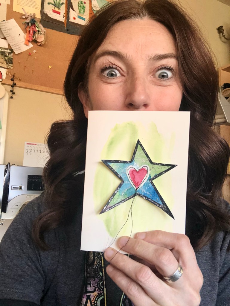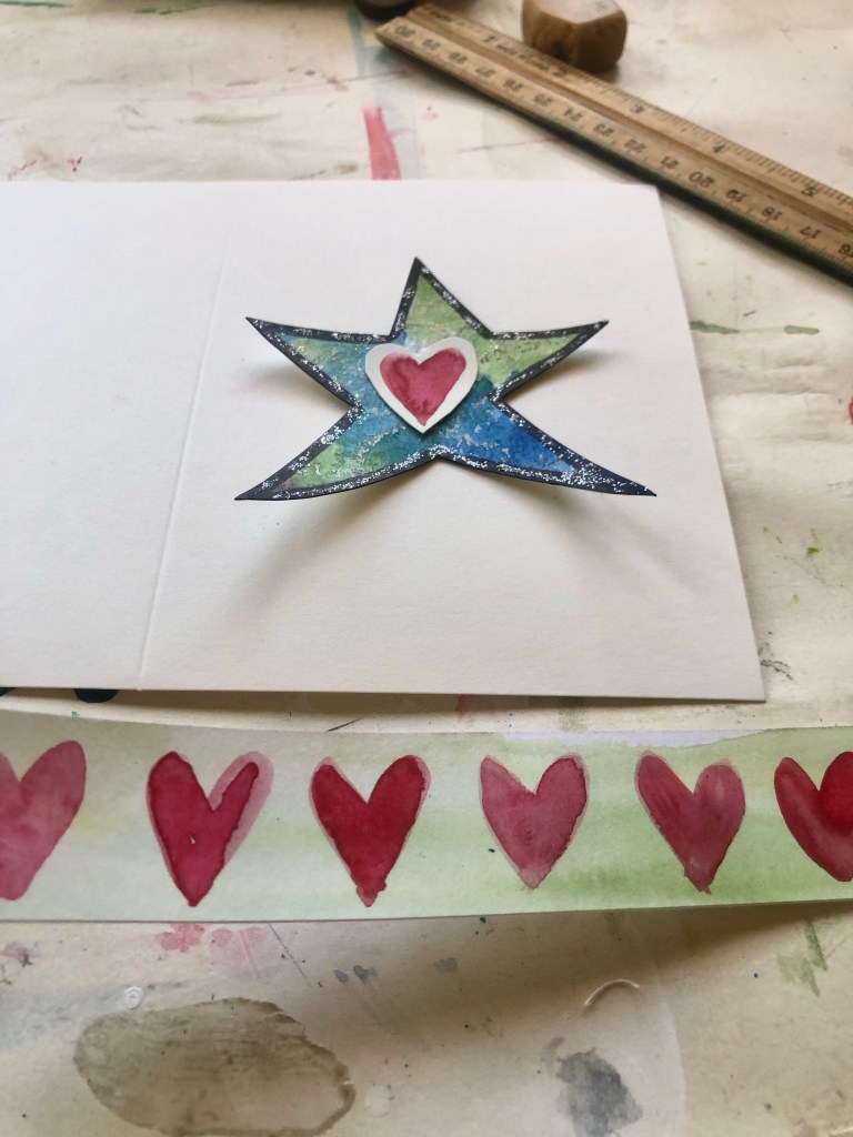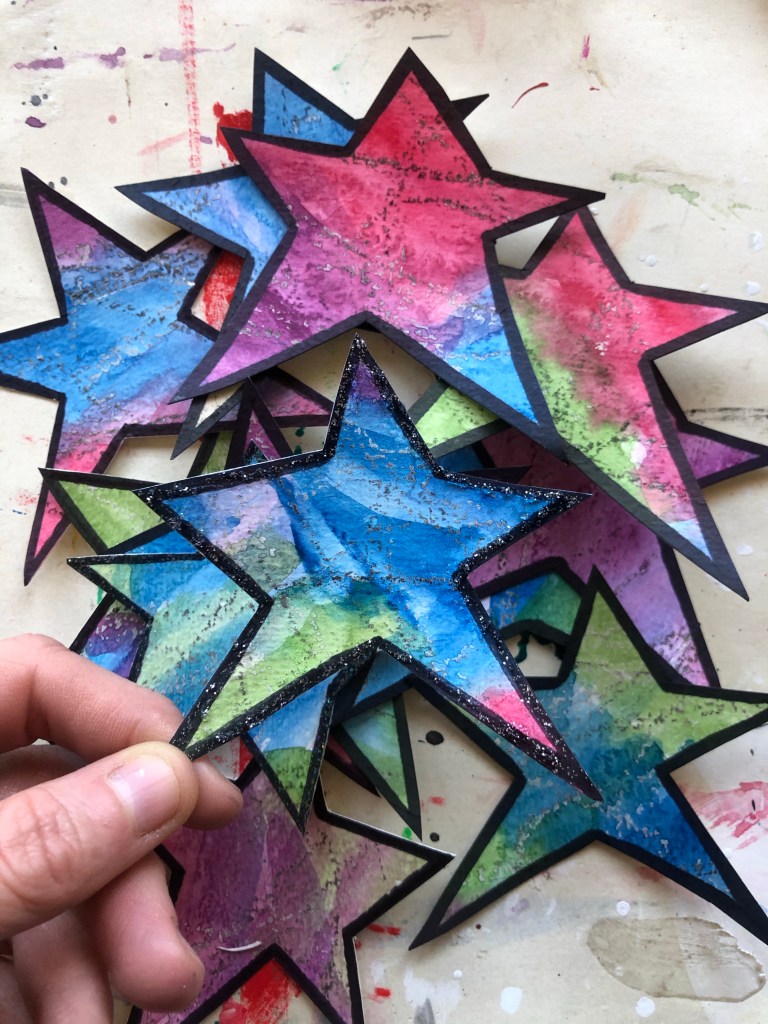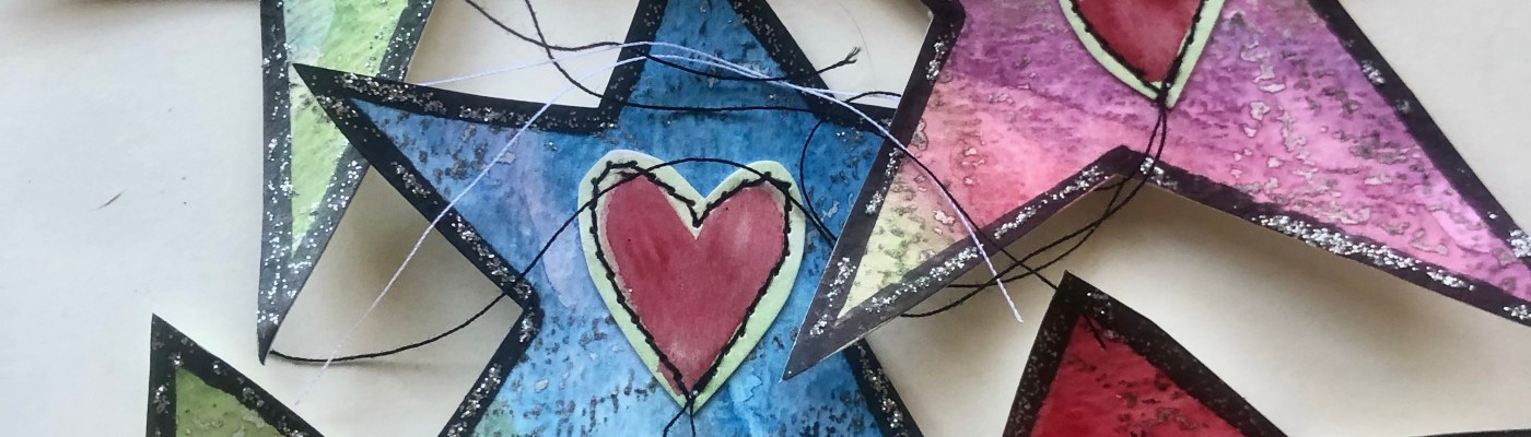 Embellish the stars with words, gems or whatever you wish….I ended up putting glitter glue around the edges. Then I painted small hearts on a strip of leftover watercolor paper, I cut them out and using my sewing machine I stitched them in the middle of the star. But if you don’t have sewing machine, consider stamping words, gluing gems or whatever your souls is telling you to do. Listen and do!