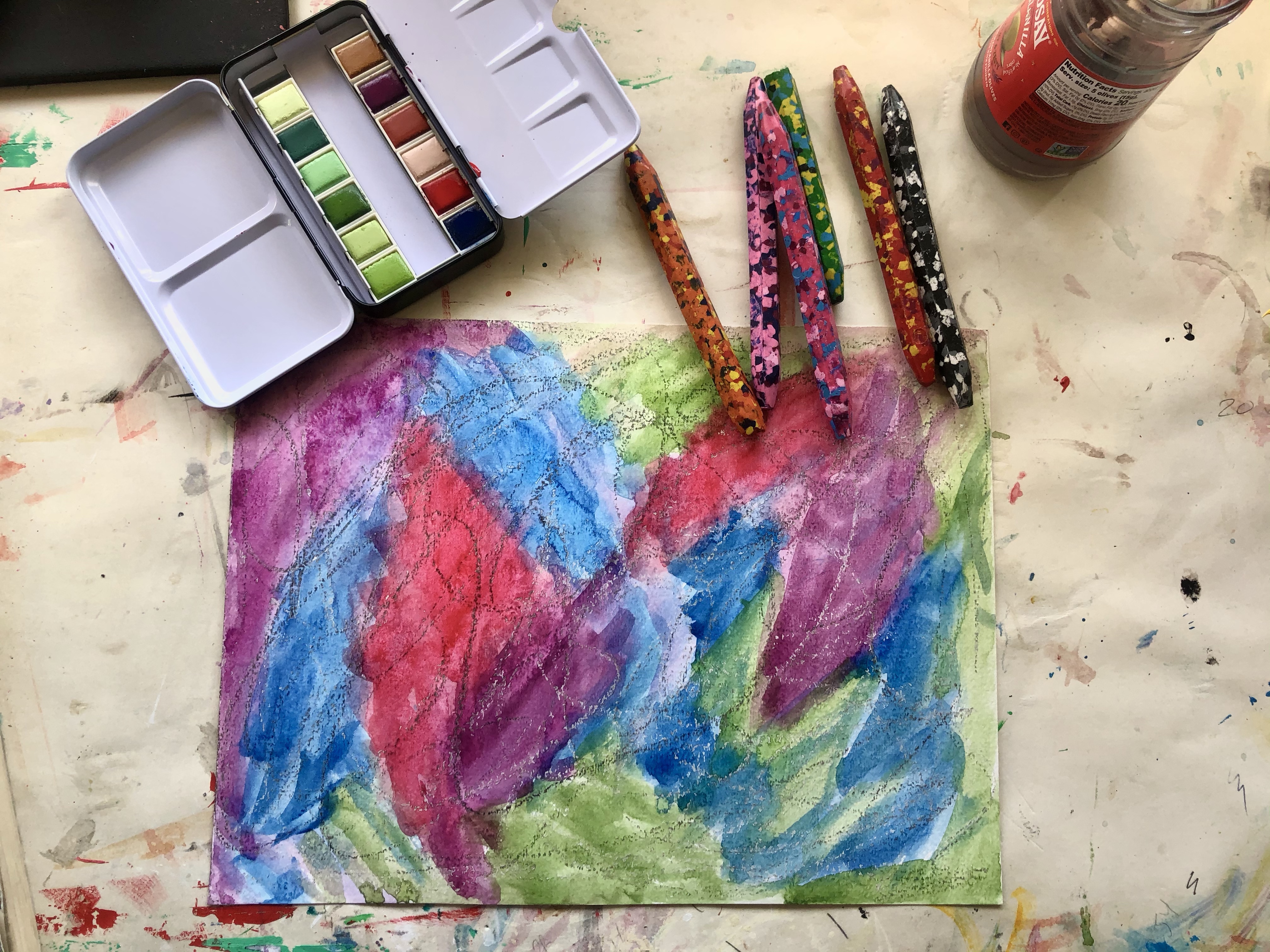 Create a water color wash. I used some crayons first to create a resist of a sort, then put all kinds of watercolors on my piece of watercolor paper.