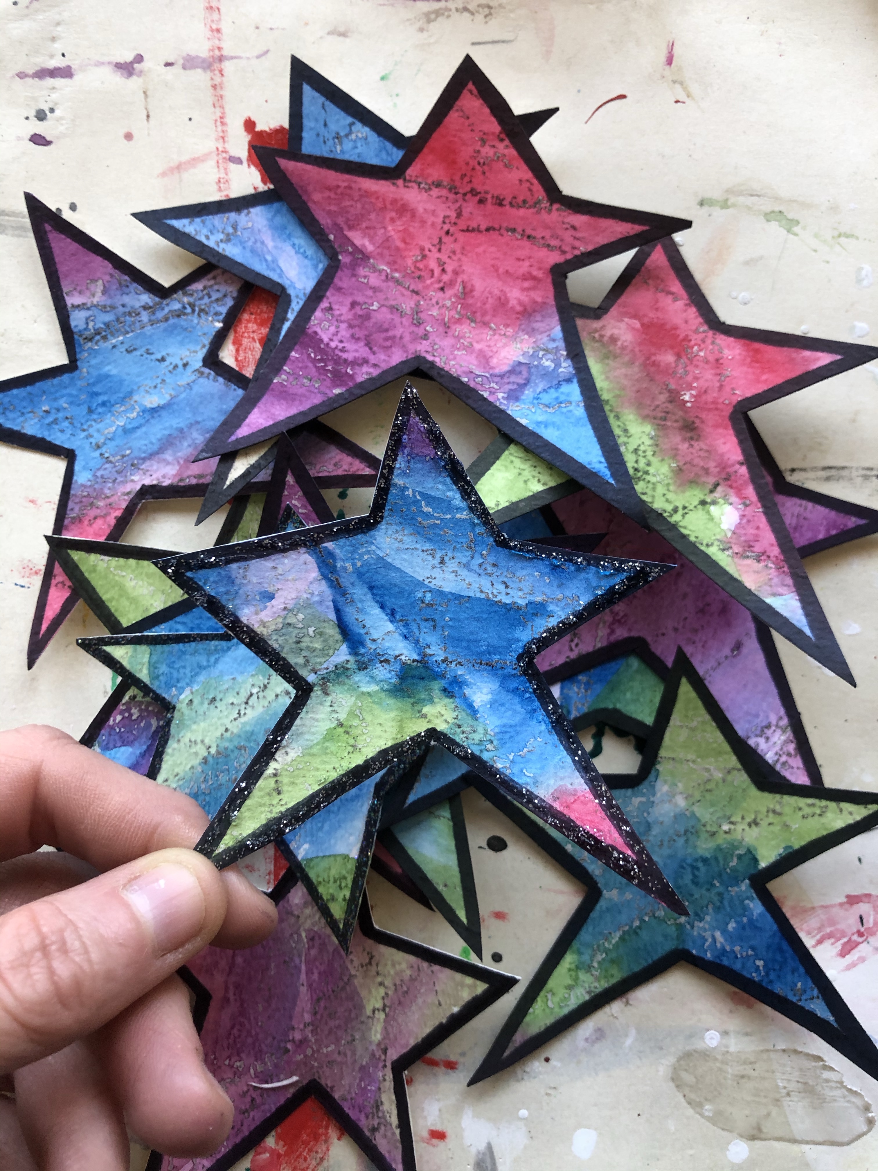 After the paper was dry I cut it into 3″x 3″ squares, and then free form cut star shapes. after I cut the star shapes I outlined them with a thick black marker (or you can use black watercolor).