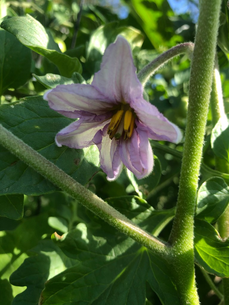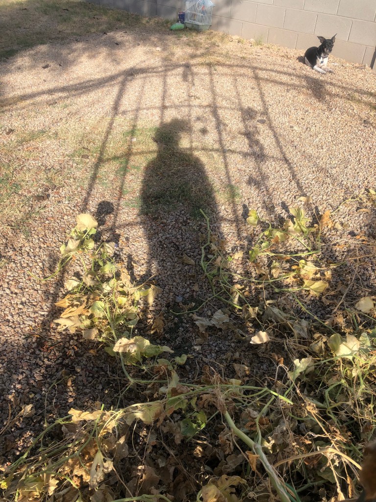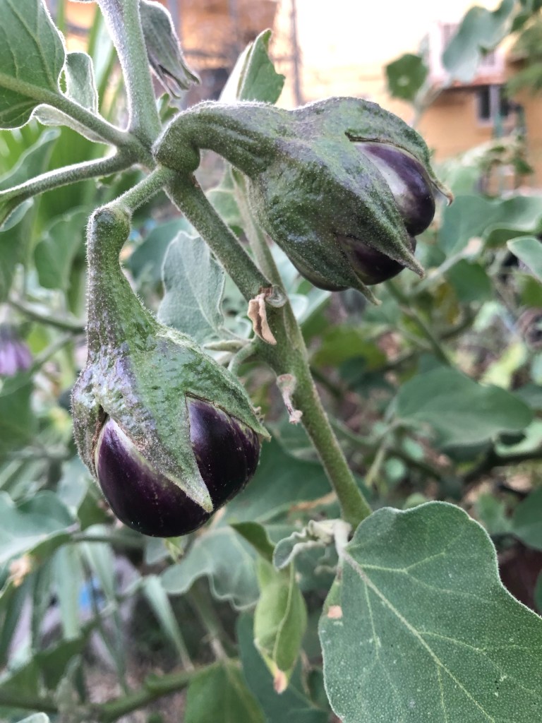 It seems that it took forever to get the first ripe tomatoes. They were green forever. I was patient (and sometimes not so patient). Then they started turning red faster than I can pick them and eat them. I was giving them away to friends at work or trading them with my neighbor. By mid summer the desert heat was too much for the tomatoes and the zucchini and they dried up. The cucumbers (Armenian) were enormous. And the eggplant was trying….Just as I was getting ready to pull everything out and start some winter veggies, the eggplant had other plans. It has expanded and the purple fruits were everywhere like beautiful glass baubles. I pulled everything else that was dead. For now I am letting the eggplant shower me with gifts for a little while longer, and today I added cabbage, cauliflower and broccoli around it.
