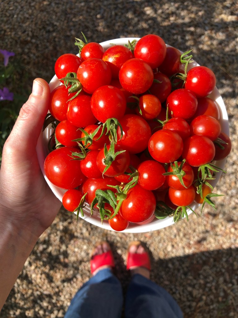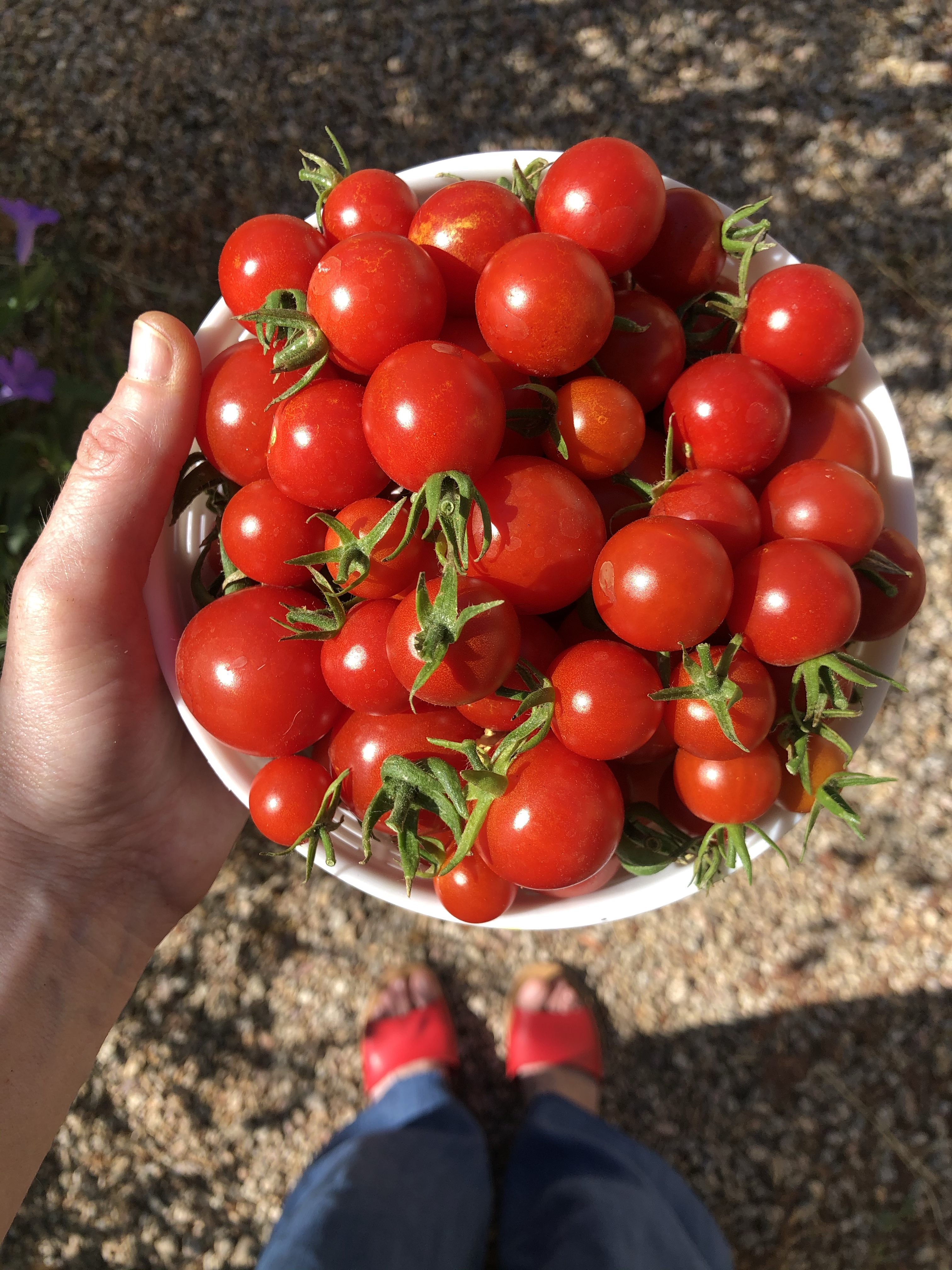 I love the photo of the ripe, red tomatoes, especially since one can see your red shoes, too! Nice composition!