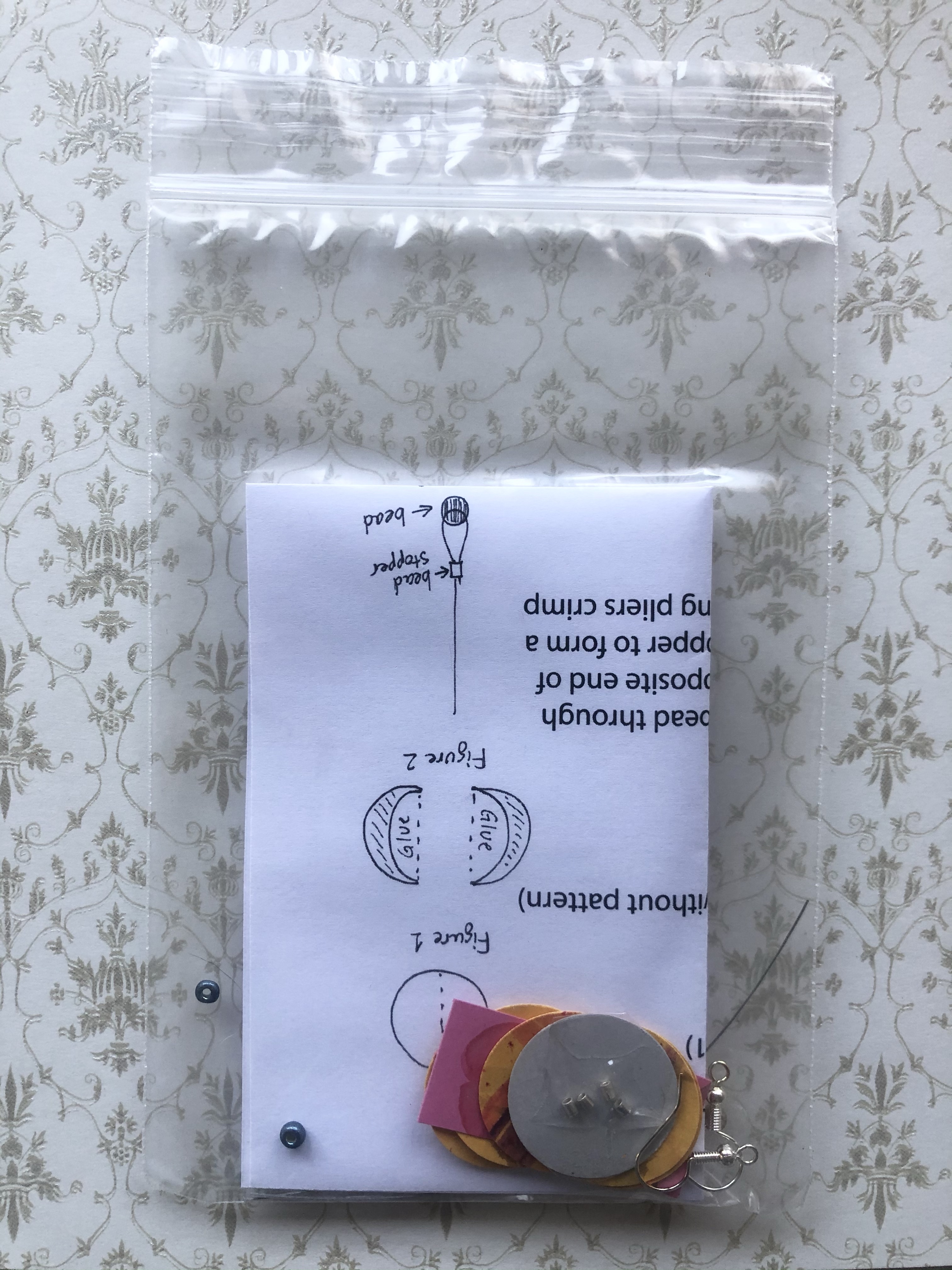 This is a kit to make your own set of paper earrings. The kit included all materials and instructions. You will need some glue and a basic jewelry plier kit: wire cutters and needle nose pliers.